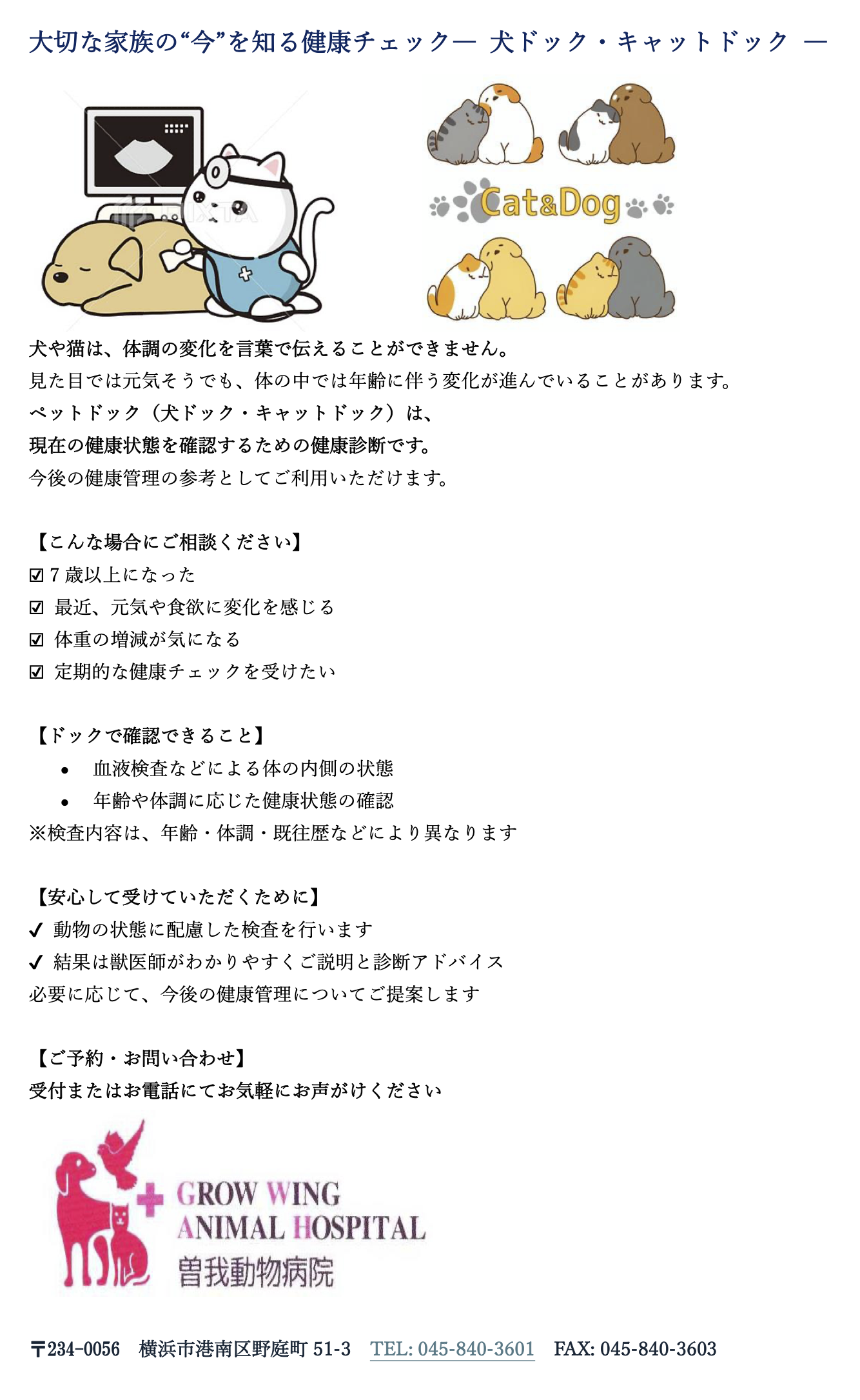 ペットドック(犬ドック・キャットドック)のお知らせ